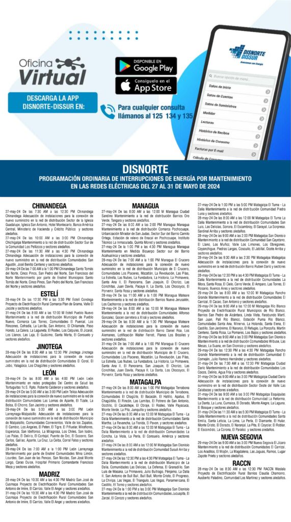 De acuerdo a la información de Disnorte, la interrupción será a diferentes horas del día; y en el caso del departamento de Managua le corresponderá los días 27 y 28 de mayo.