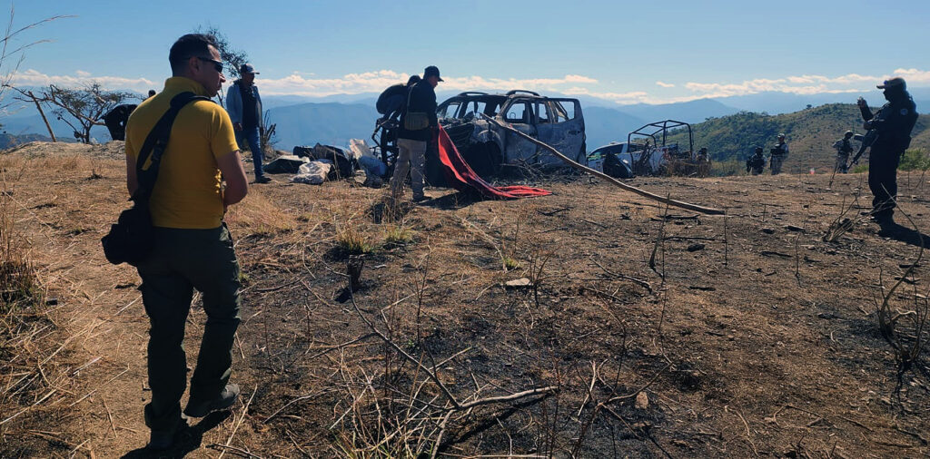 MEX5589. HELIODORO CASTILLO (MÉXICO), 06/01/2024.- Fotografía cedida hoy por el Centro de Derechos Humanos Minerva Bello, donde se observa a personal forense y de seguridad en la zona donde se perpetró un ataque armado el pasado 4 de enero, en el municipio Heliodoro Castillo, estado Guerrero (México). Al menos cinco cráneos humanos, varios cuerpos, calcinados, seis personas heridas y varios desaparecidos es el saldo, hasta ahora, tras un nuevo ataque armado en la sierra de Heliodoro Castillo, municipio del estado de Guerrero, sur de México. EFE/Centro de Derechos Humanos Minerva Bello/ SÓLO USO EDITORIAL/SÓLO DISPONIBLE PARA ILUSTRAR LA NOTICIA QUE ACOMPAÑA (CRÉDITO OBLIGATORIO)