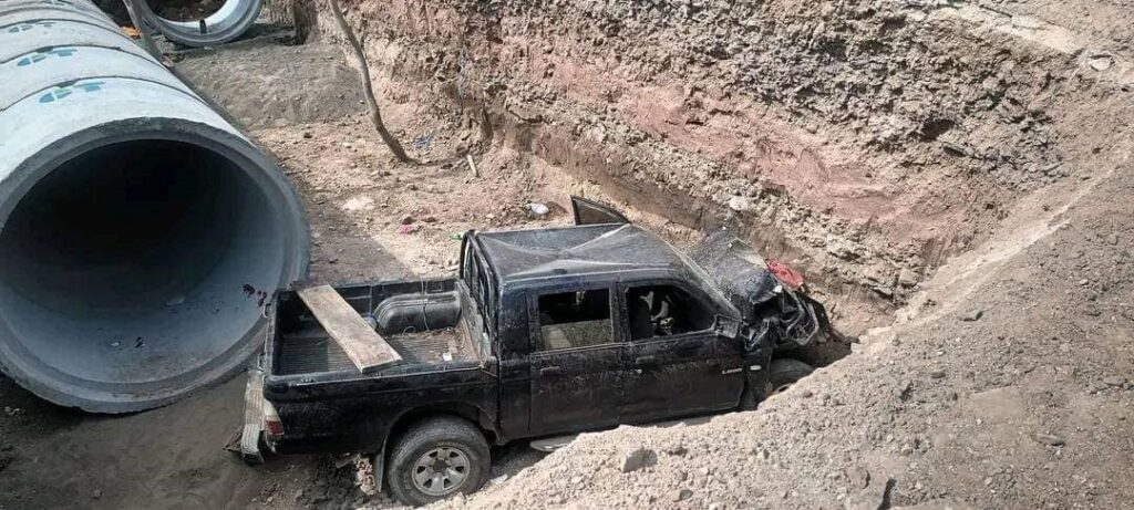 En esa misma zanja, este lunes también cayó una camioneta que iba a exceso de velocidad, resultando dos mujeres lesionadas.