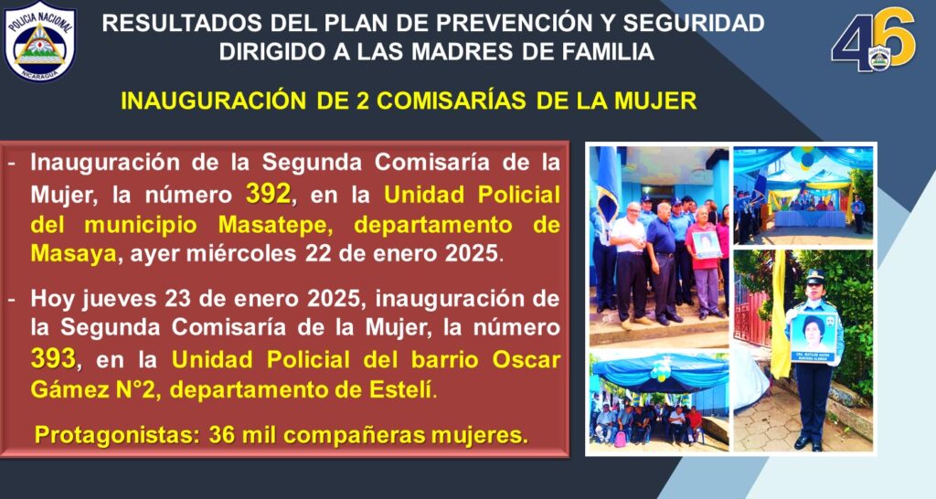 La Policía Nacional inauguró este jueves una Comisaria de la Mujer en Masaya y otra en el barrio Óscar Gámez del departamento de Estelí, ambas corresponden a la 392 y 393 instaladas por el Gobierno Central beneficiando a 36 mil protagonistas, informó el Inspector General, Jaime Vanegas.