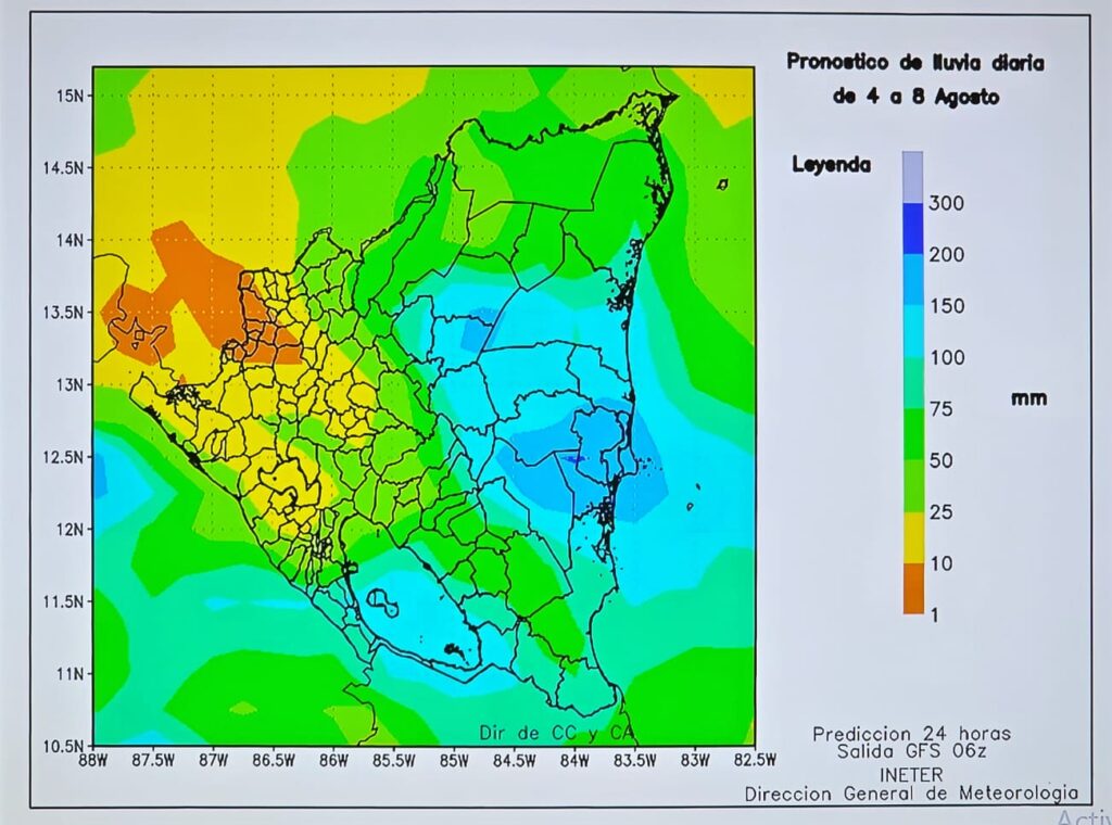 “La onda número 18, ya generó lluvias en la Costa Caribe Norte y Sur; y también un poco en la región norte centro y, en horas de la tarde, probablemente generará chubascos y lluvias débiles en el occidente y en el Pacífico centro. La onda tropical 19 iniciará su desplazamiento por el territorio nicaragüense el día miércoles, generando lluvias de moderada a fuerte en la Costa Caribe y débiles en el resto del territorio. Entre jueves y viernes, el fin de semana tendremos chubascos aislados en la región del pacífico y lluvias de débiles a moderadas en la Costa Caribe, es decir, una semana de lluvias en todo el territorio nacional”, detalló el Director de Cambio Climático del Ineter, Manuel Prado.