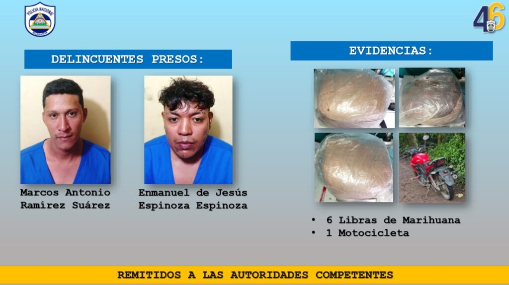 La comisionada Obando, explicó, que el segundo operativo se realizó en Jinotega capturando al motorizado Marcos Antonio Ramírez Suárez, de 34 años de edad y su acompañante Enmanuel de Jesús Espinoza e incautándoles seis libras de marihuana.