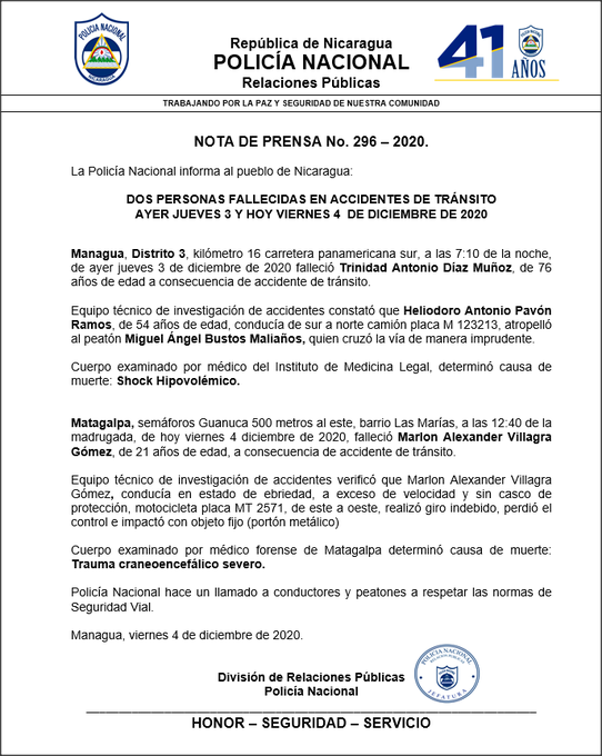 La Policía Nacional informa al Pueblo de Nicaragua, sobre el fallecimiento de dos personas en accidentes de tránsito en Managua y Matagalpa
