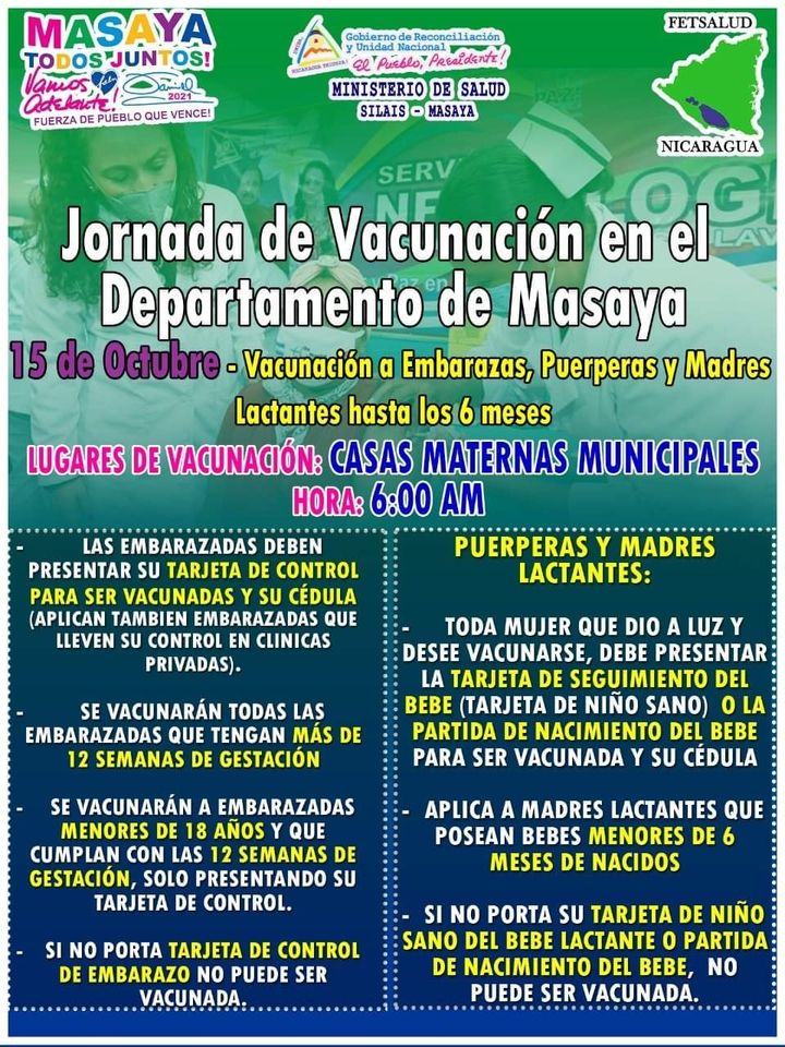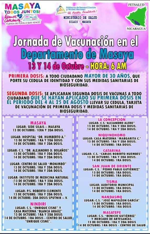 Este 13 y 14 de octubre en todos los municipios del departamento de Masaya el Ministerio de Salud, estará realizando la jornada de vacunación voluntaria contra la Covid-19.