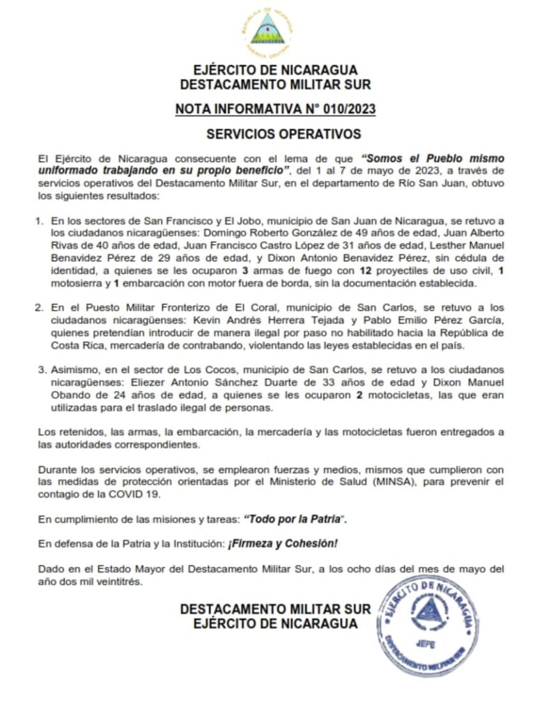 (Comunicado).- El Ejército de Nicaragua del 1 al 7 de mayo de 2023, a través de servicios operativos del Destacamento Militar Sur, en el departamento de Río San Juan, obtuvo los siguientes resultados: