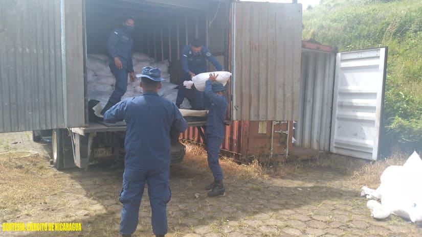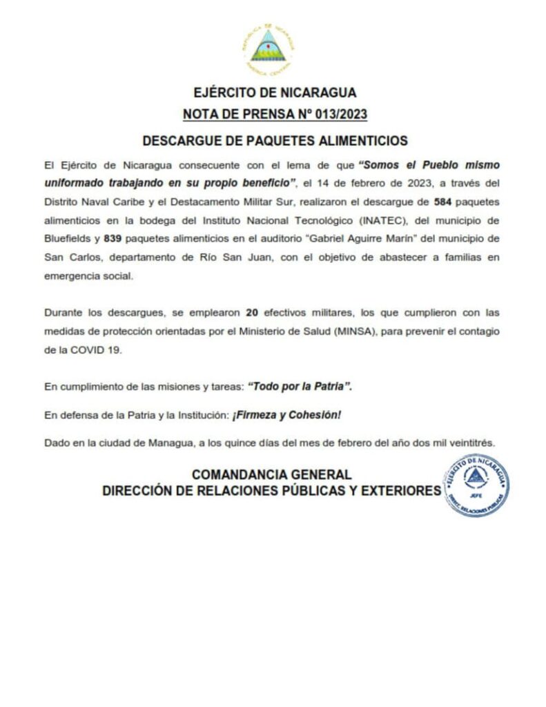 (Comunicado) El Ejército de Nicaragua a través del Distrito Naval Caribe y el Destacamento Militar Sur, realizaron el descargue de 584 paquetes alimenticios en la bodega del Instituto Nacional Tecnológico (INATEC), del municipio de Bluefields y 839 paquetes alimenticios en el auditorio “Gabriel Aguirre Marín” del municipio de San Carlos, departamento de Río San Juan, con el objetivo de abastecer a familias en emergencia social.