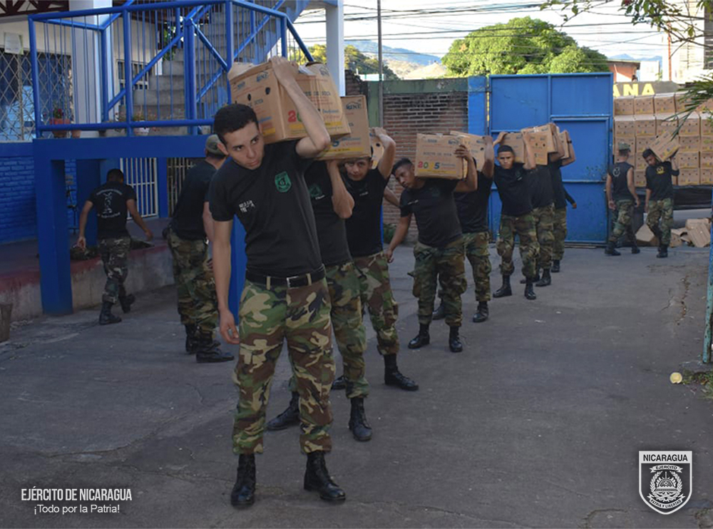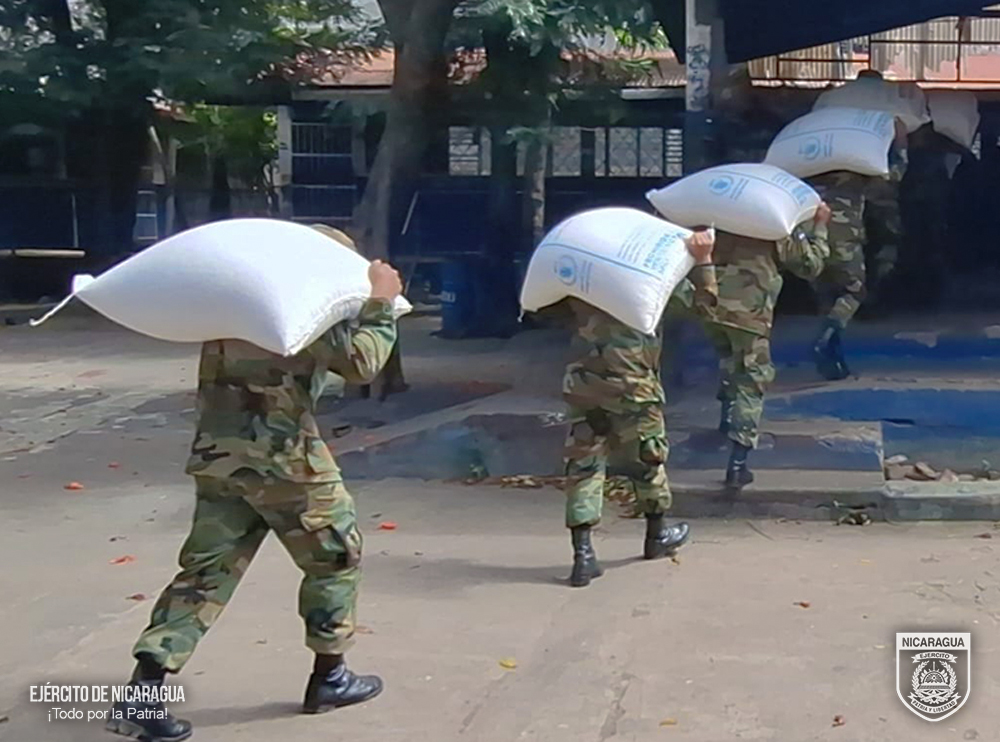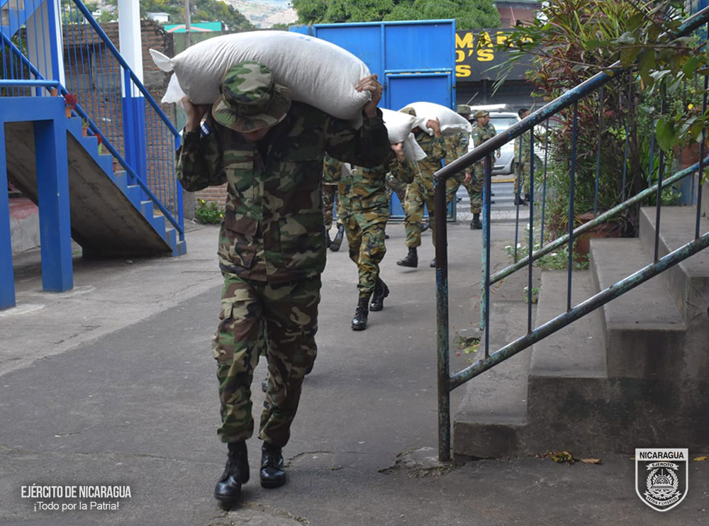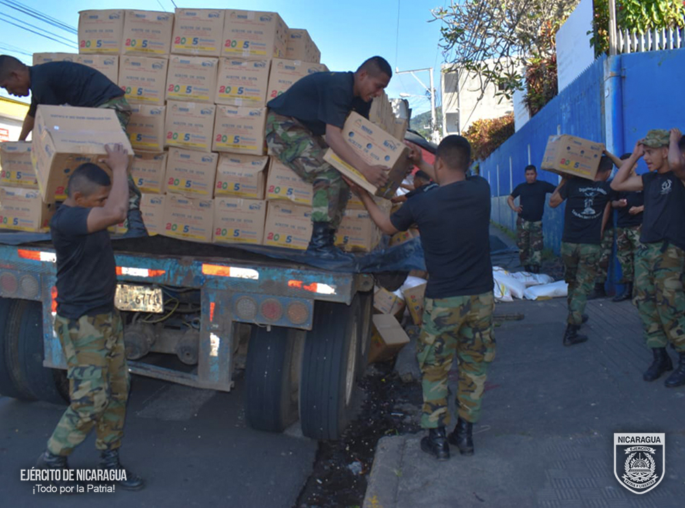 El Ejército de Nicaragua participó en el descargue de 6 mil 314 quintales de alimentos (arroz, frijoles, cereal y maíz) y 23 mil 428 litros de aceite, en la bodega de la escuela El Progreso, del municipio de Matagalpa, departamento de Matagalpa.