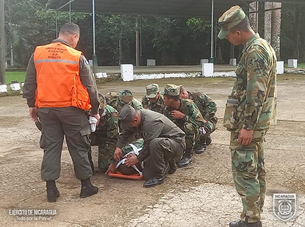 Autoridades del Ejército de Nicaragua brindaron capacitaciones en primeros auxilios, control de incendios, búsqueda y rescate, entre otros, a cinco brigadas de respuesta ante emergencias en el departamento de Río San Juan.