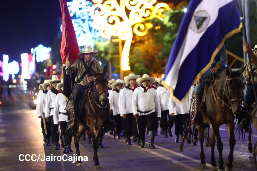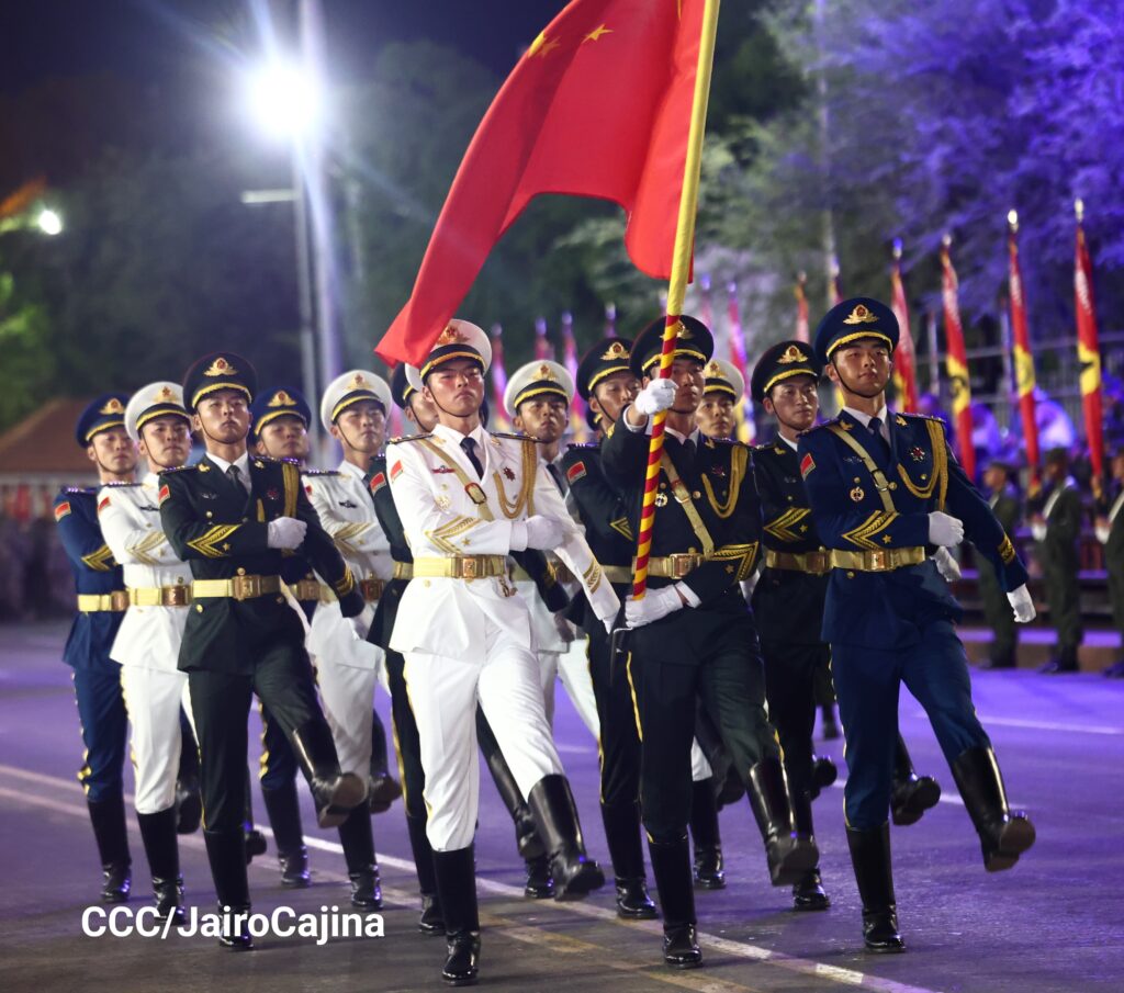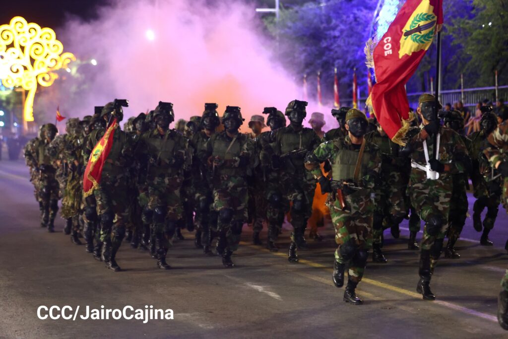 Sobre la Avenida de Bolívar a Chávez de esta capital desfilaron, después de las 10 de la noche del viernes, las tropas del Ejército de Nicaragua y bloques representativos de las Fuerzas Armadas de México, Honduras, Cuba, Venezuela, China y Rusia, delegaciones que fueron invitadas a la celebración del próximo lunes.