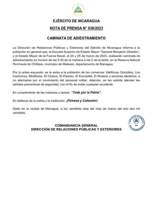 (Comunicado) La Dirección de Relaciones Públicas y Exteriores del Ejército de Nicaragua informa a la población en general que, la Escuela Superior de Estado Mayor “General Benjamín Zeledón”, y el Estado Mayor de la Fuerza Naval, el 24 y 25 de marzo de 2023, realizarán caminata de adiestramiento en horario de las 5:30 de la mañana a las 2 de la tarde, en la Reserva Natural Península de Chiltepe, municipio de Mateare, departamento de Managua.