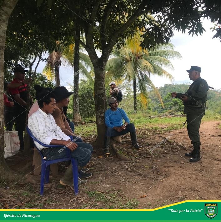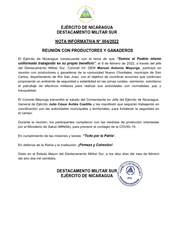 El Ejército de Nicaragua consecuente con el lema “Somos el Pueblo mismo uniformado trabajando en su propio beneficio”, a través del jefe del Destacamento Militar Sur, Coronel Inf. DEM Manuel Antonio Mayorga, el 9 de febrero de 2022, se participó en reunión con productores y ganaderos de la comunidad Nuevo Chontales, municipio de San Carlos, departamento de Río San Juan, con el objetivo de coordinar acciones que continúen propiciando un ambiente de seguridad y estabilidad en las zonas rurales; asimismo, solicitaron el patrullaje de efectivos militares para realizar sus actividades con normalidad, paz y tranquilidad.