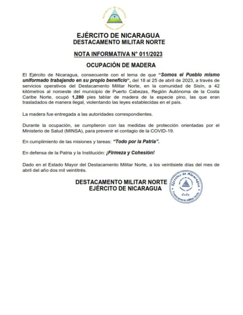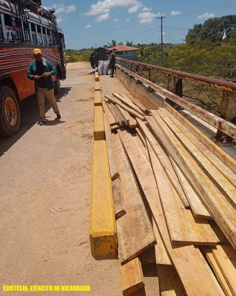 El Ejército de Nicaragua a través de servicios operativos del Destacamento Militar Norte, en la comunidad de Sisín, a 42 kilómetros al noroeste del municipio de Puerto Cabezas, Región Autónoma de la Costa Caribe Norte, ocupó 1,280 pies tablar de madera de la especie pino, las que eran trasladados de manera ilegal, violentando las leyes establecidas en el país.