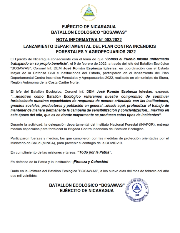 El Ejército de Nicaragua a través del jefe del Batallón Ecológico “BOSAWAS”, Coronel Inf. DEM José Román Espinoza Iglesias, en coordinación con el Estado Mayor de la Defensa Civil e instituciones del Estado, el 9 de febrero de 2022, se participó en el lanzamiento del Plan Departamental Contra Incendios Forestales y Agropecuarios 2022, realizado en el municipio de Siuna, Región Autónoma de la Costa Caribe Norte.