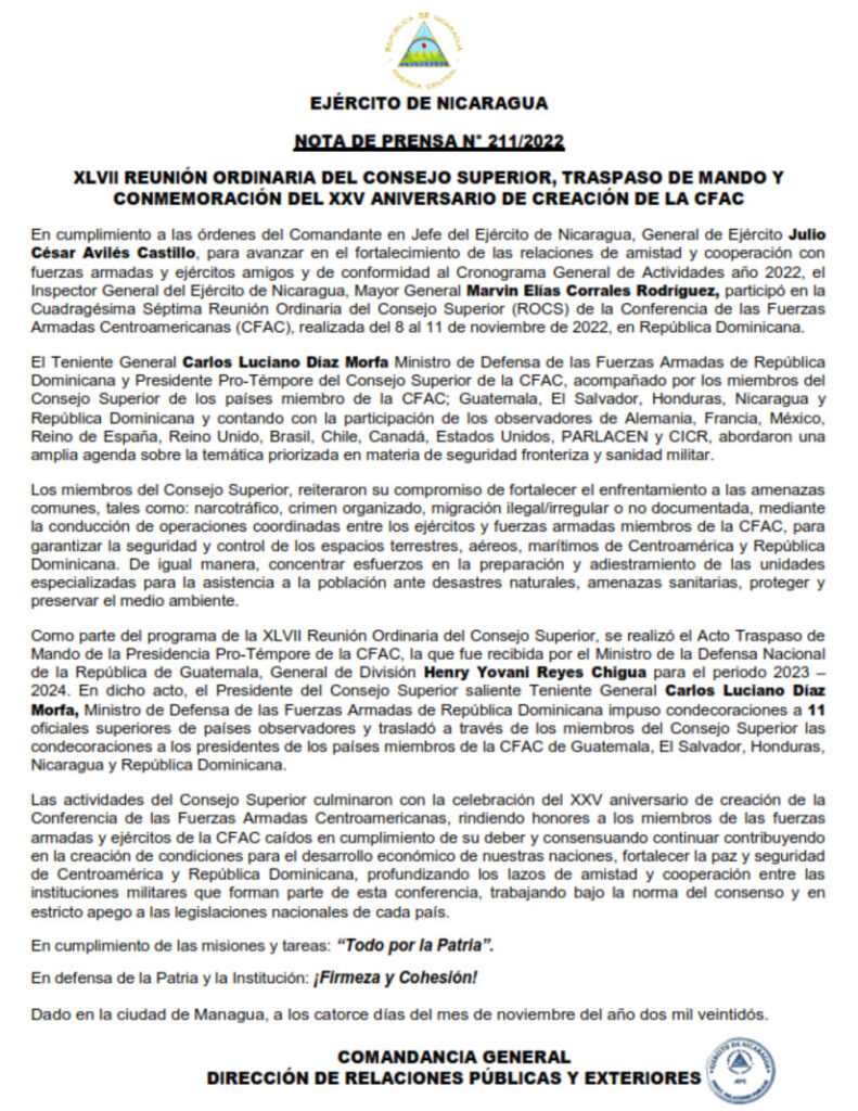 (Comunicado) En cumplimiento a las órdenes del Comandante en Jefe del Ejército de Nicaragua, General de Ejército Julio César Avilés Castillo, para avanzar en el fortalecimiento de las relaciones de amistad y cooperación con fuerzas armadas y ejércitos amigos y de conformidad al Cronograma General de Actividades año 2022, el Inspector General del Ejército de Nicaragua, Mayor General Marvin Elías Corrales Rodríguez, participó en la Cuadragésima Séptima Reunión Ordinaria del Consejo Superior (ROCS) de la Conferencia de las Fuerzas Armadas Centroamericanas (CFAC), realizada del 8 al 11 de noviembre de 2022, en República Dominicana.