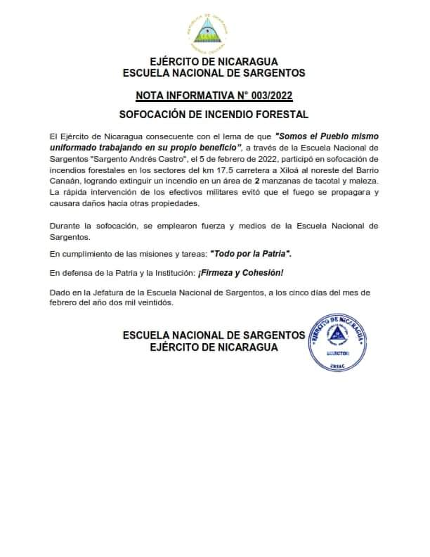 El Ejército de Nicaragua a través de la Escuela Nacional de Sargentos “Sargento Andrés Castro”, el 5 de febrero de 2022, participó en sofocación de incendios forestales en los sectores del km 17.5 carretera a Xiloá al noreste del Barrio Canaán, logrando extinguir un incendio en un área de 2 manzanas de tacotal y maleza. La rápida intervención de los efectivos militares evitó que el fuego se propagara y causara daños hacia otras propiedades.