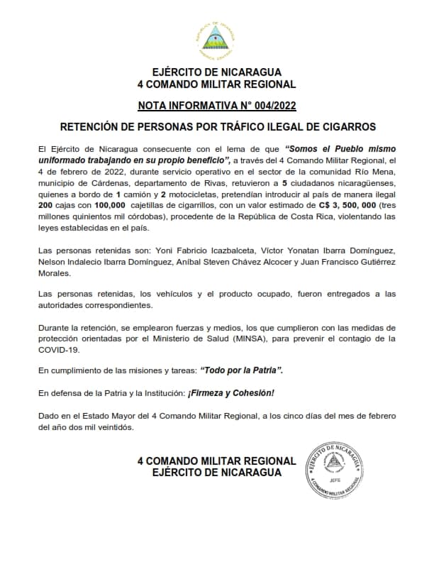 El Ejército de Nicaragua a través del 4 Comando Militar Regional, el 4 de febrero de 2022, durante servicio operativo en el sector de la comunidad Río Mena, municipio de Cárdenas, departamento de Rivas, retuvieron a 5 ciudadanos nicaragüenses, quienes a bordo de 1 camión y 2 motocicletas, pretendían introducir al país de manera ilegal 200 cajas con 100,000 cajetillas de cigarrillos, con un valor estimado de C$ 3, 500, 000 (tres millones quinientos mil córdobas), procedente de la República de Costa Rica, violentando las leyes establecidas en el país.