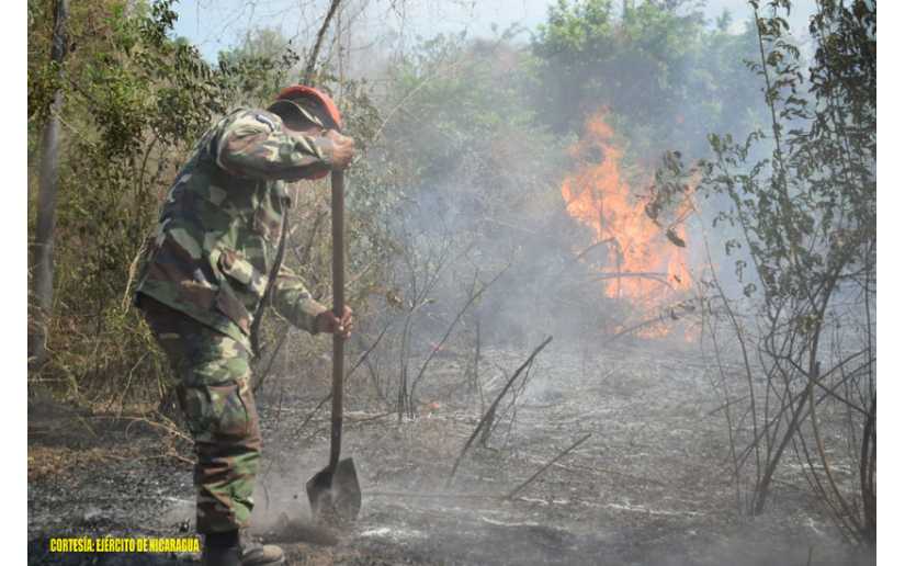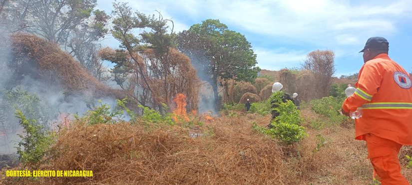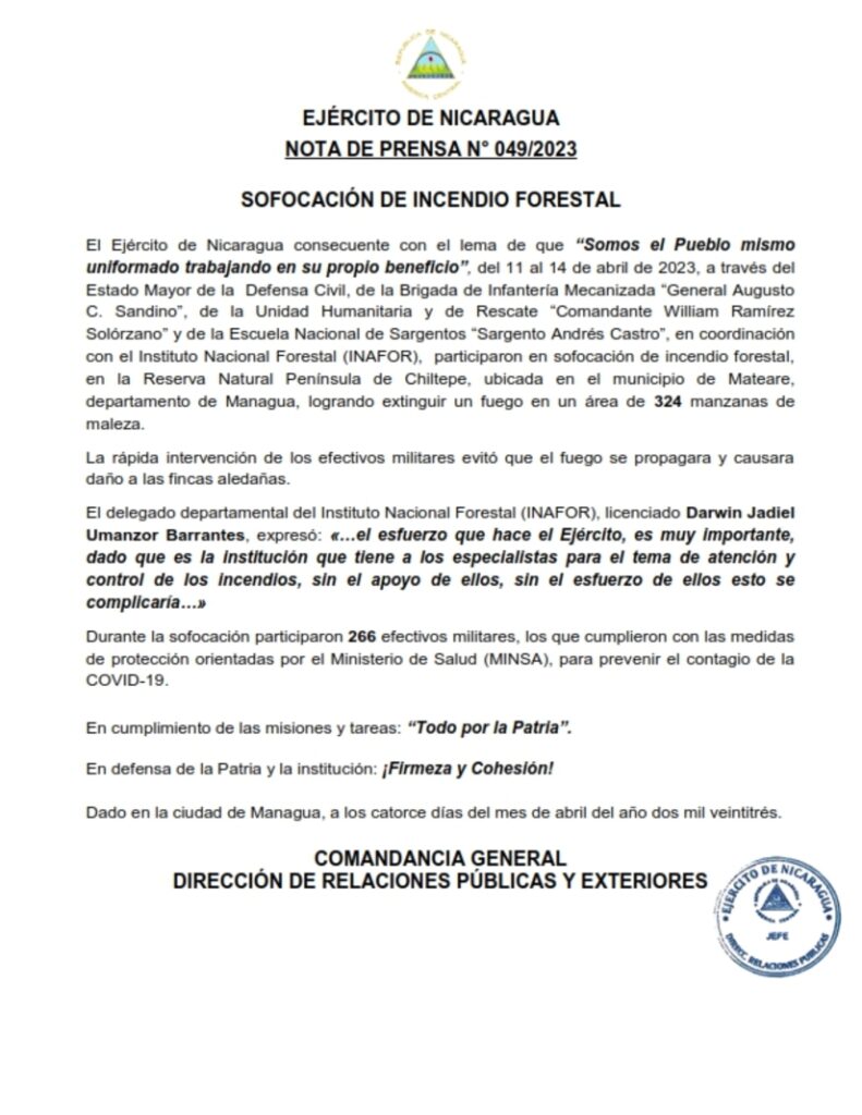 (Comunicado) El Ejército de Nicaragua a través del Estado Mayor de la Defensa Civil, de la Brigada de Infantería Mecanizada “General Augusto C. Sandino”, de la Unidad Humanitaria y de Rescate “Comandante William Ramírez Solórzano” y de la Escuela Nacional de Sargentos “Sargento Andrés Castro”, en coordinación con el Instituto Nacional Forestal (INAFOR), participaron en sofocación de incendio forestal, en la Reserva Natural Península de Chiltepe, ubicada en el municipio de Mateare, departamento de Managua, logrando extinguir un fuego en un área de 324 manzanas de maleza.