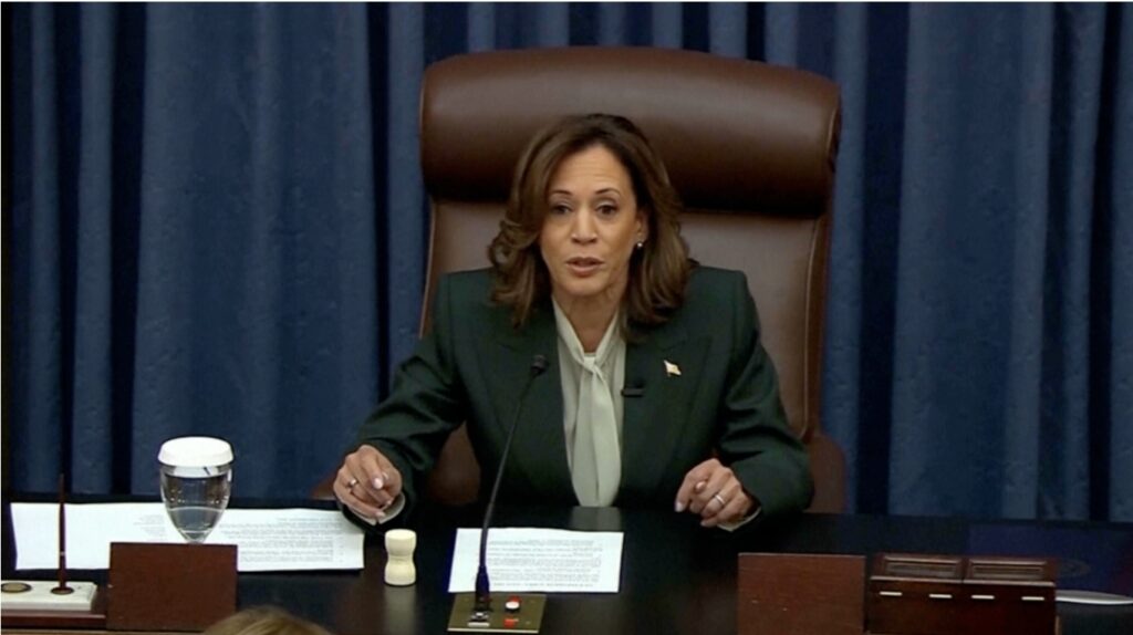 La vicepresidenta estadounidense, Kamala Harris, titubeó el viernes mientras recitaba el juramento a la bandera de EEUU en la primera reunión del Senado del 119º Congreso.