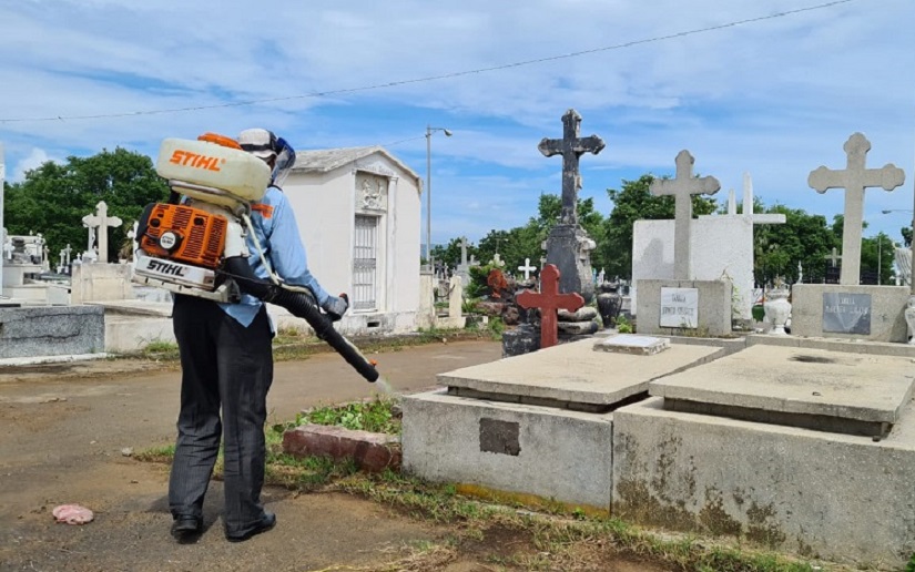 En víspera del 2 de noviembre, Día de los Fieles Difuntos, el Ministerio de Salud encoordinación con las alcaldías municipales, desarrolla un plan para la protección de los cementerios, el que consiste en limpieza, erradicación de criaderos de zancudos, fumigación y aplicación de BTI en las pilas y barriles que están en los camposantos municipales y comunitarios.