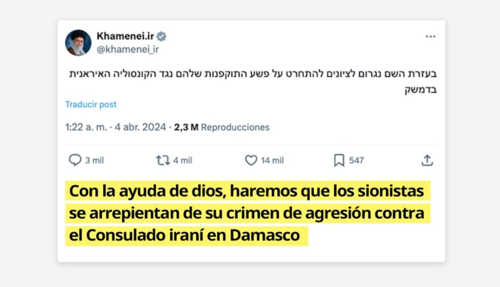 “Con la ayuda de dios, haremos que los sionistas se arrepientan de su crimen de agresión contra el Consulado iraní en Damasco”, reza el mensaje.