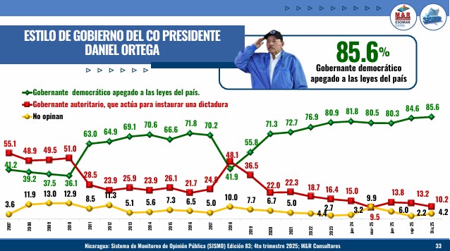 La más reciente encuesta de M&R Consultores sobre la opinión pública, reveló este miércoles que el 86.7% de los nicaragüenses aseguran que los Copresidentes Comandante Daniel Ortega y la Compañera Rosario Murillo conducen al país por la dirección correcta.