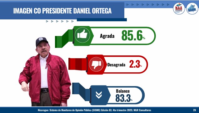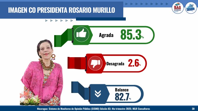 Por otro lado, el 89.6% aprueba la gestión que realiza el Comandante Daniel Ortega en el poder legislativo y el 85.6% aprueban el trabajo desarrollado por la Copresidenta Compañera Rosario Murillo.