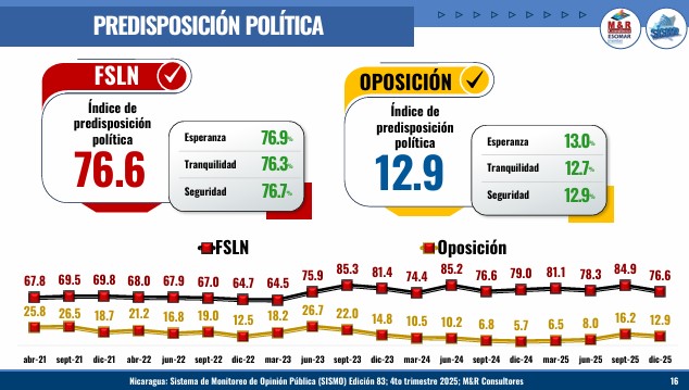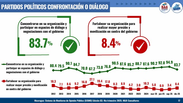 Asimismo, el 85.6% indicaron que los Copresidentes trabajan por los intereses de la población en general y no para su propio beneficio, en tanto, el 82.7% opinaron que los gobernantes buscan la unidad y la reconciliación de todos los nicaragüenses.