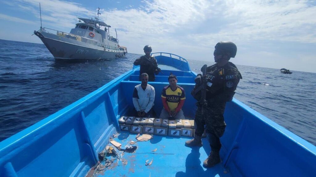En la primera acción fue interceptada una embarcación a 990 millas al suroeste de la Bocana El Cordoncillo, Estero de Jaltepeque, conducida por dos personas de nacionalidad ecuatoriana que trasladaban mil 560 kilos de cocaína, valorados en 38.9 millones de dólares.