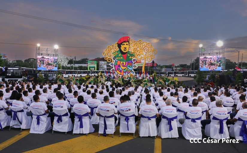 Desde la Avenida de Bolívar a Chávez, el Presidente Comandante Daniel Ortega Saavedra y la Vicepresidenta Compañera Rosario Murillo, presiden el acto glorioso en celebración del heroísmo del pueblo nicaragüense, entregando nuevas unidades de buses a cooperativas de transporte intermunicipal.