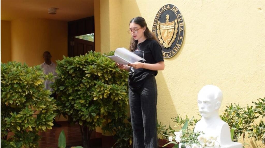 La joven Camila Martínez, al intervenir en el acto denunció el impacto directo del cerco en niños, adolescentes y jóvenes cubanos, y recordó que la medida unilateral de Washington es una condena diaria que limita el acceso a medicamentos, materiales escolares, alimentos y a un futuro digno.