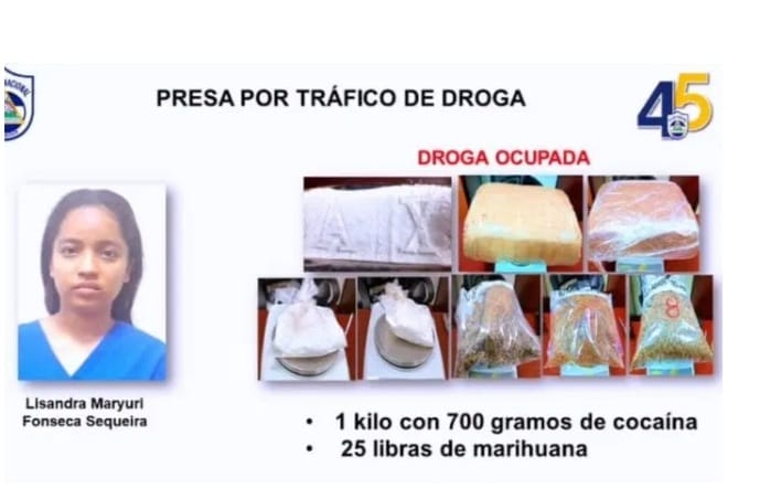 Este jueves la policía de Nueva Guinea en el Caribe Sur presentó a la joven Lizandra Maryuri Fonseca Sequeira, quien a inicios de la semana fue apresada al encontrarle en su poder un kilo con 700 gramos de cocaína y 25 libras de marihuana.
