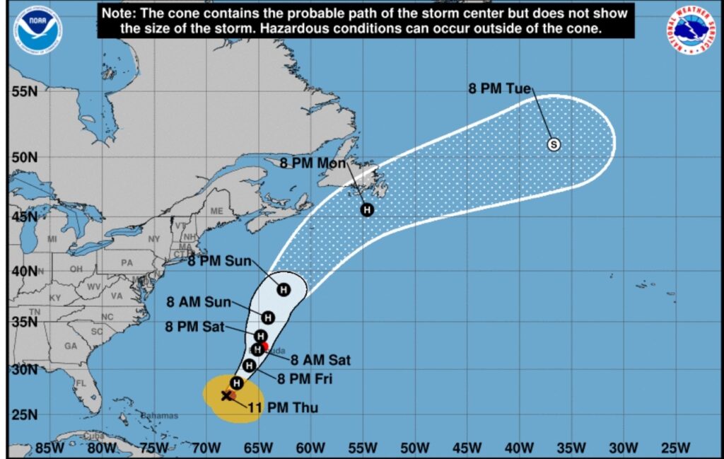 Se espera que la tormenta siga intensificándose, pudiendo el viernes estar “próximo a alcanzar la fuerza de un huracán mayor“. Se pronostica que el sábado se debilitará a su paso cerca o sobre Bermudas.