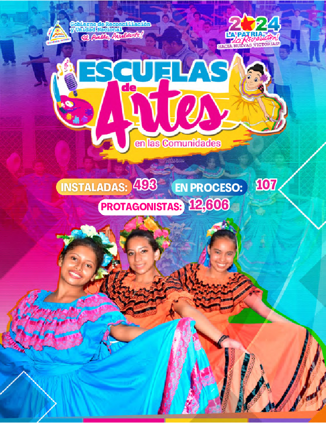 El Gobierno de Reconciliación y Unidad Nacional (GRUN) hace saber el funcionamiento de las 493 escuelas de artes instaladas durante este año a lo largo de todo el territorio nacional.