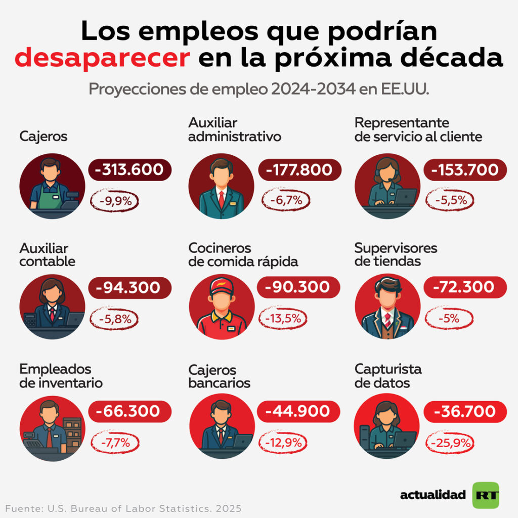 En este contexto, la Oficina de Estadísticas Laborales de EE.UU. publicó recientemente una lista de profesiones del país en las que se espera el mayor descenso en el número de puestos de trabajo para 2034.