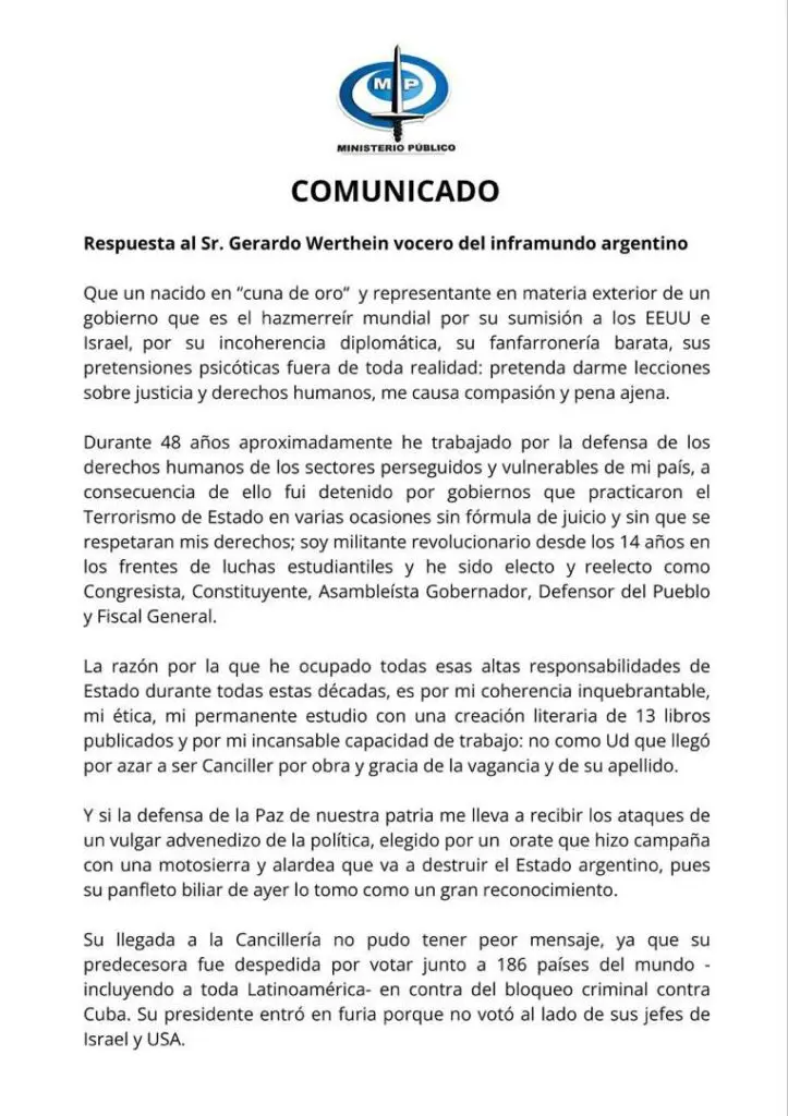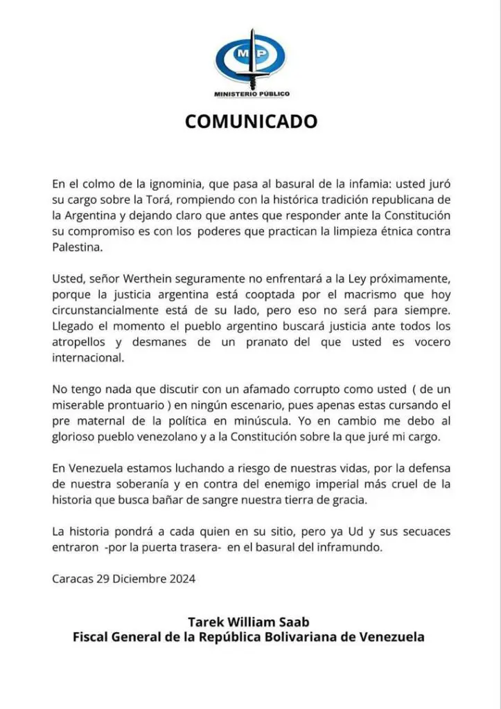 En el documento, titulado «Respuesta al Sr. Gerardo Werthein vocero del inframundo argentino», William Saab califica al titular de Relaciones Exteriores como “un nacido en ‘cuna de oro’ y representante en materia exterior de un gobierno que es el hazmerreír mundial por su sumisión a los EE. UU. e Israel”.