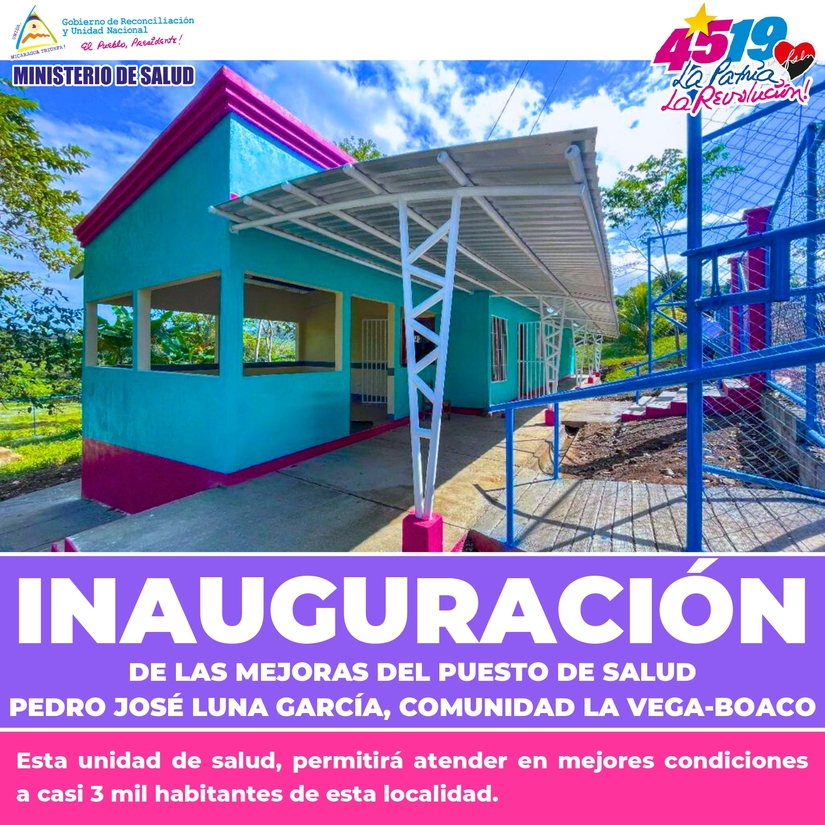 Aproximadamente 3 mil habitantes de la comunidad La Vega, del municipio de Boaco recibirán atención primaria en el nuevo Puesto de Salud Pedro José Luna García que fue inaugurada las obras de rehabilitación este lunes, destacó en el sitio web de canal 4.