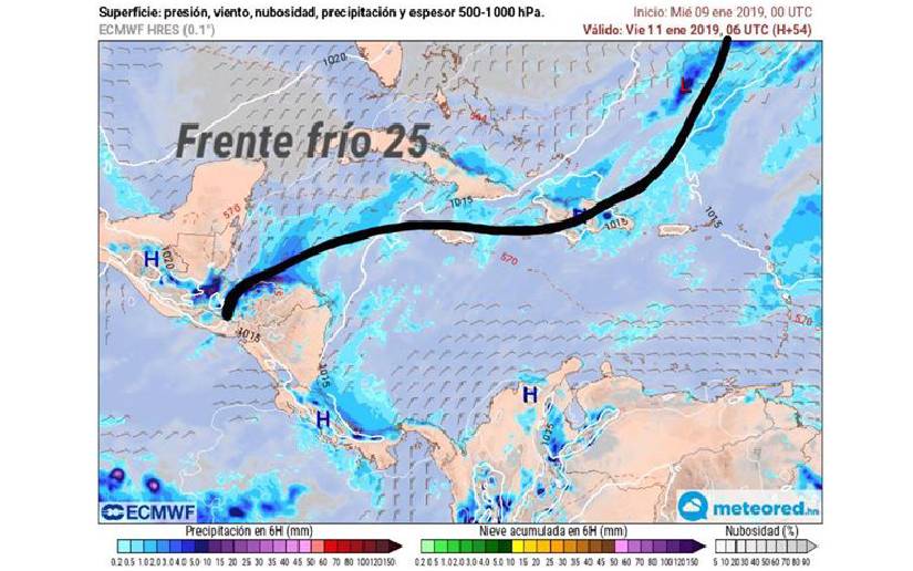 (Comunicado) El Ejército de Nicaragua a través del Distrito Naval Caribe, en el marco de las leyes y misiones establecidas en la Constitución Política de la República de Nicaragua, informa a dueños de embarcaciones menores, turismo, armadores y dueños de acopios que, se mantiene en monitoreo del frente frío N° 25, el cual se desplazará sobre la costa Este de los Estados Unidos de América y el Golfo de México, el cual afectará a partir del 20/01/23 hasta el 23/01/23, con vientos de 16 a 22 nudos (30 km/h – 40 km/h) y olas de 3.7 a 5.7 pies de altura (1.5 metros – 1.73 metros).