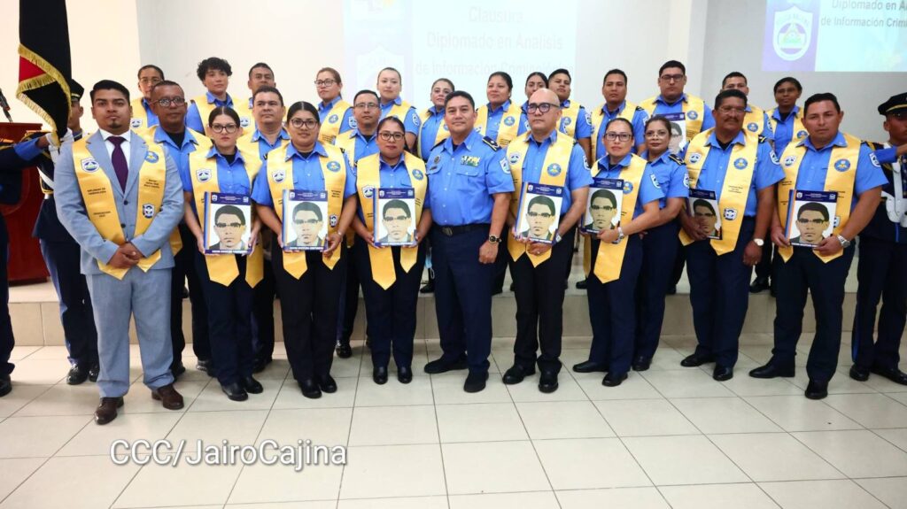Efectivos de las especialidades de la Dirección de Inteligencia Policial, Contrainteligencia, Dirección de Auxilio Judicial, Dirección de Antinarcótico y de la Universidad en Ciencias Policiales Leonel Rugama, concluyeron este martes el Primer Diplomado en Análisis de Información Criminológica.
