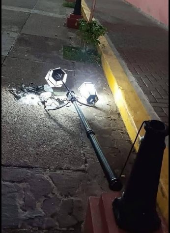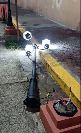 Tras ingresar a la vía, el conductor del pesado vehículo provocó daños en algunos de los faroles que se ubican a lo largo de la calle, desprendiéndolos de sus bases de concreto.