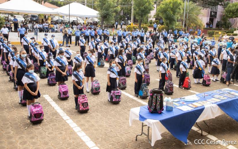 Hijos de oficiales caídos en cumplimiento de su servicio, así como los hijos de funcionarios de las especialidades nacionales y órganos de apoyo de la entidad policial, recibieron paquetes escolares por parte del gobierno sandinista.