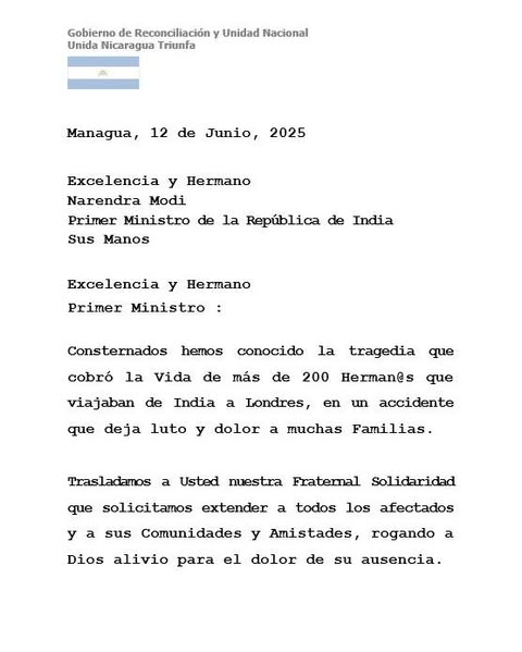 Gobierno de Nicaragua expresa solidaridad por accidente aéreo en India donde murieron más de 200 personas