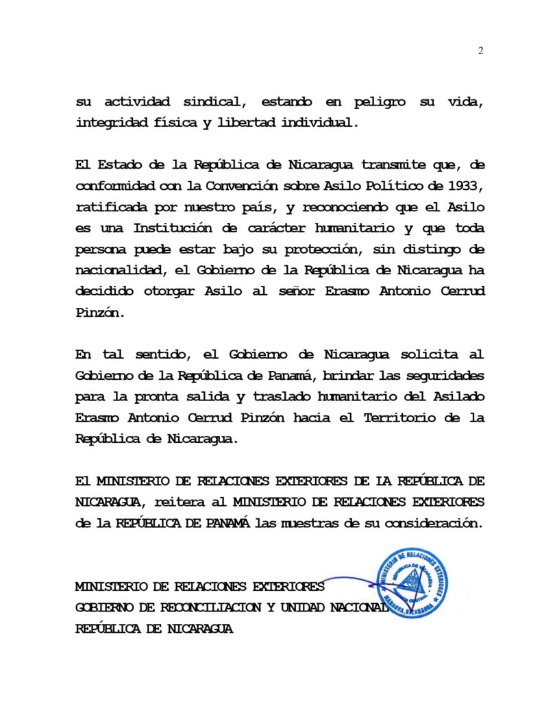 El Estado de la República de Nicaragua transmite que, de conformidad con la Convención sobre Asilo Político de 1933, ratificada por nuestro país, y reconociendo que el asilo es una Institución de carácter humanitario y que toda persona puede estar bajo su protección, sin distingo de nacionalidad, el Gobierno de la República de Nicaragua ha decidido otorgar asilo al señor Erasmo Antonio Cerrud Pinzón.