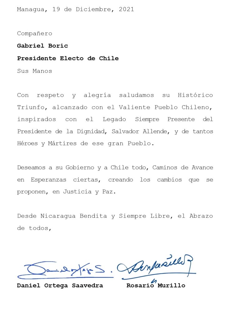 Gobierno de Nicaragua saluda a Gabriel Boric, Presidente Electo de Chile