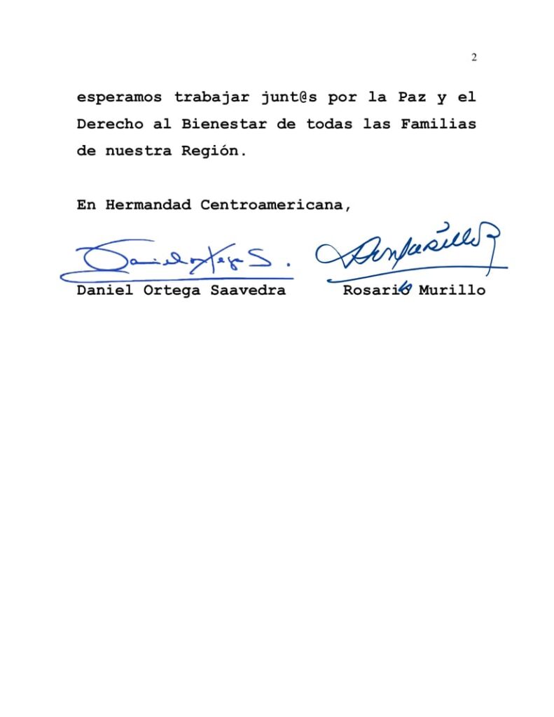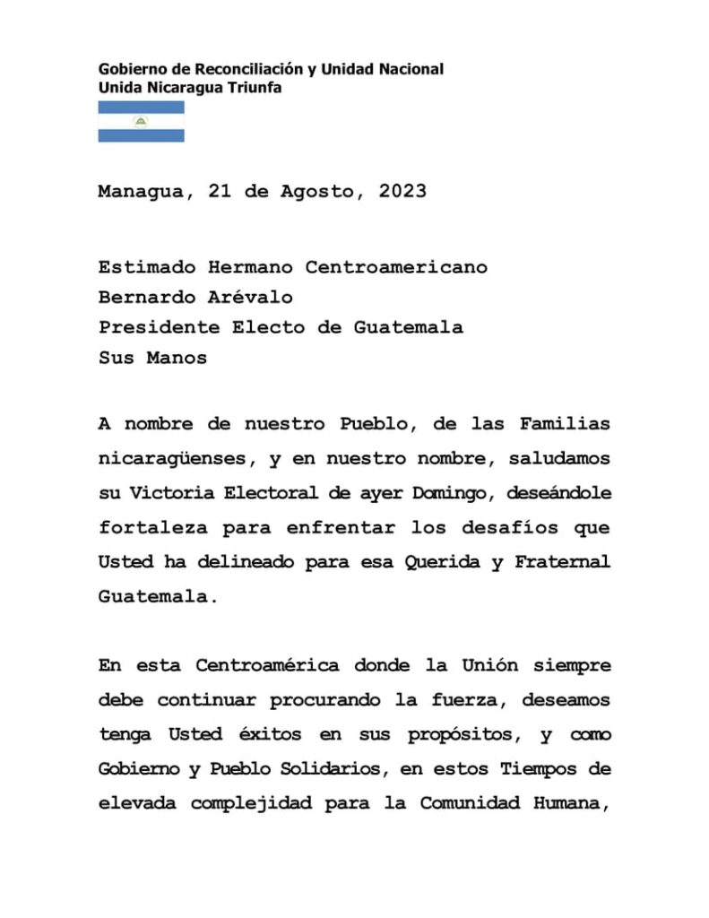 A nombre de nuestro Pueblo, de las Familias nicaragüenses, y en nuestro nombre, saludamos su Victoria Electoral de ayer Domingo, deseándole fortaleza para enfrentar los desafíos que Usted ha delineado para esa Querida y Fraternal Guatemala.