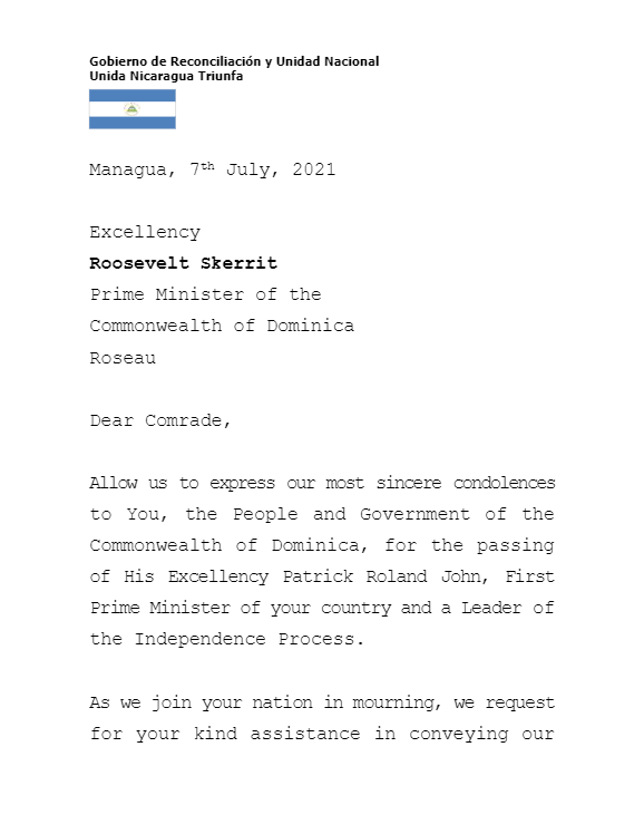 Gobierno de Nicaragua también lamenta fallecimiento de Patrick Roland John 1er Primer Ministro de la Mancomunidad de Dominica por una enfermedad común