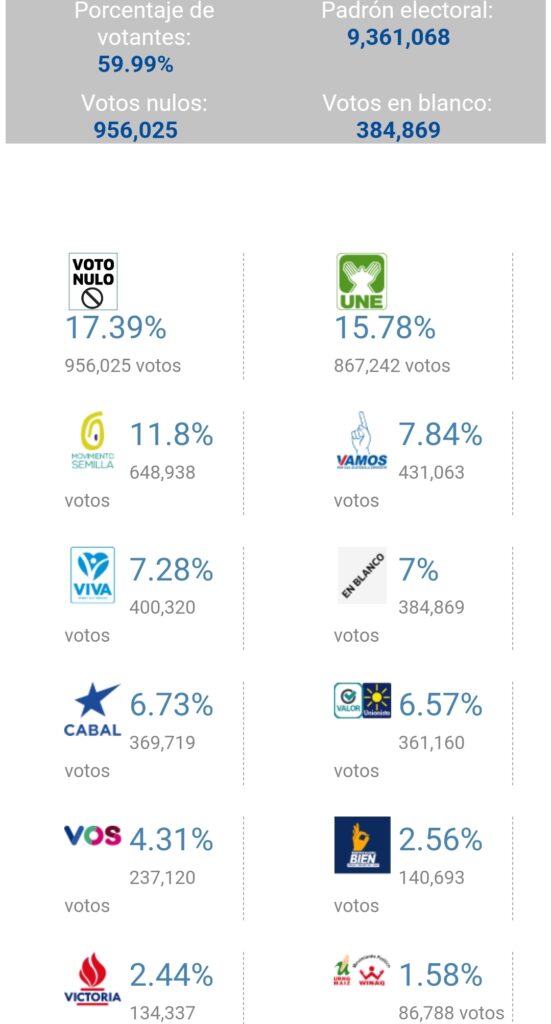 Sin embargo el voto nulo (954,466), se perfila como el ganador al sumar el 17.3% de los votos emitidos, mientras el abstencionismo llegó al 40% (3,660,575) de los 9.3 millones de guatemaltecos convocados a votar.