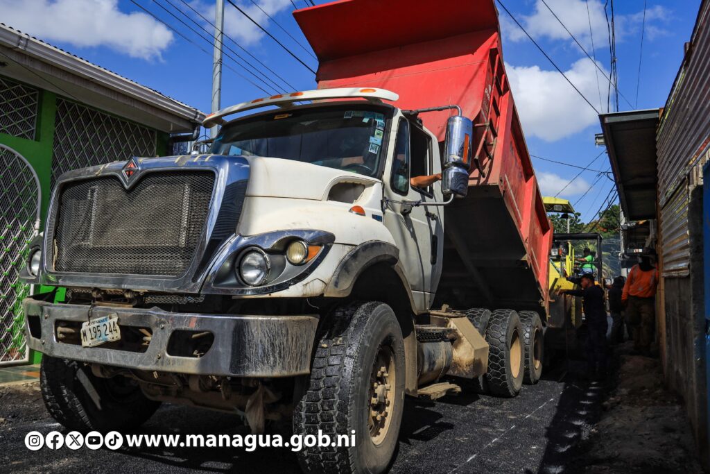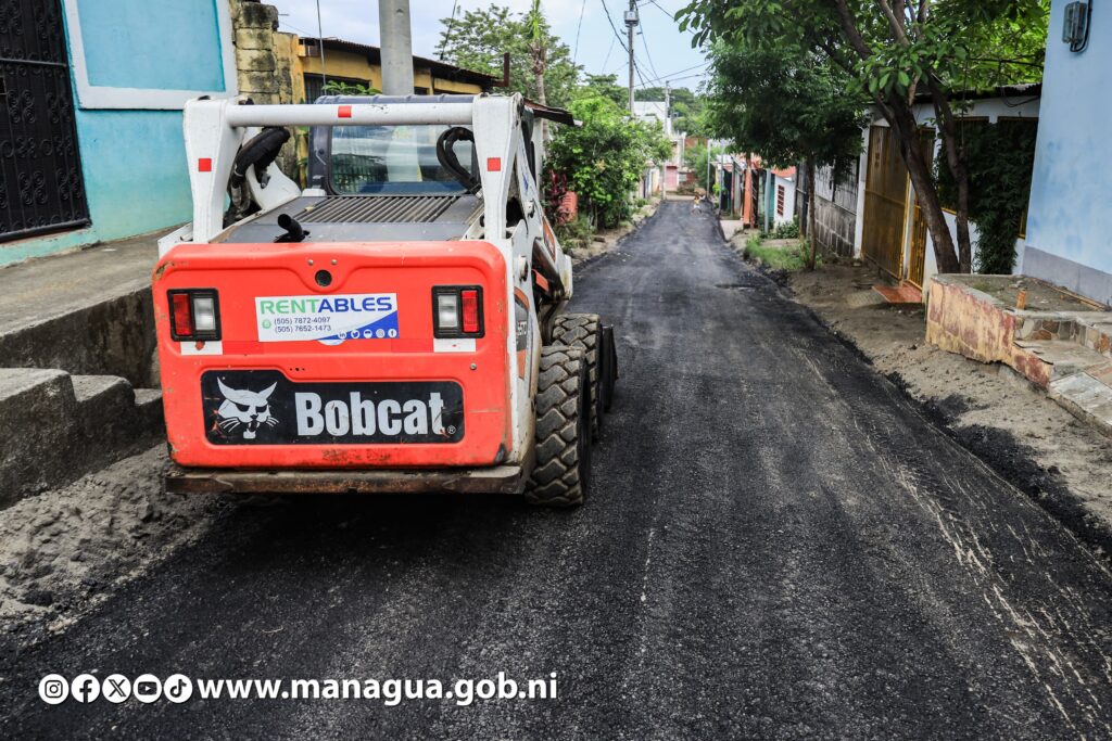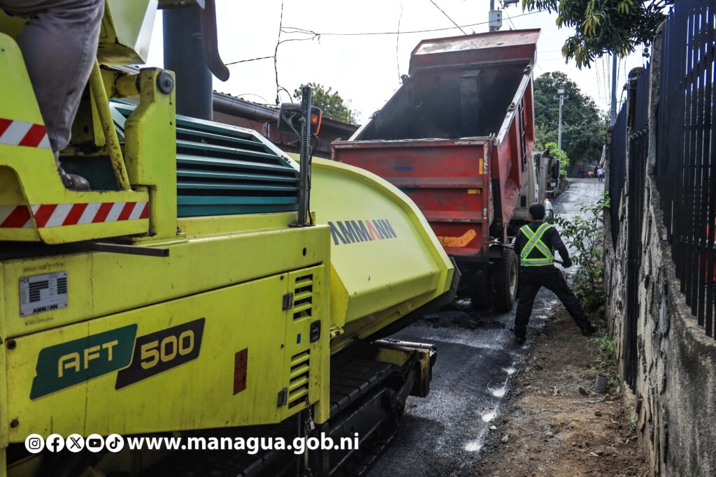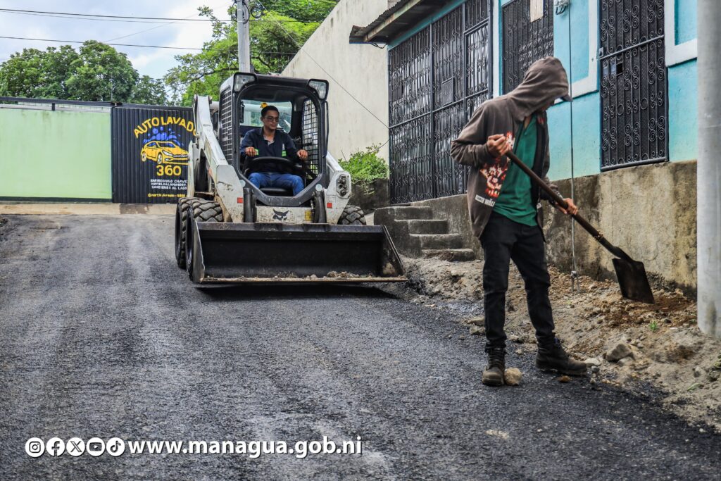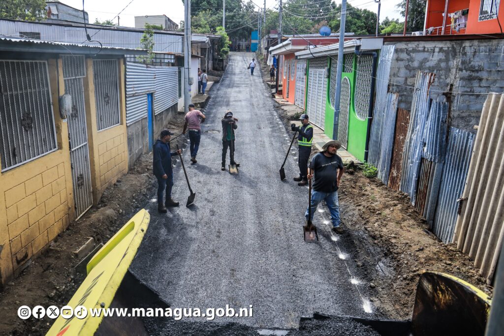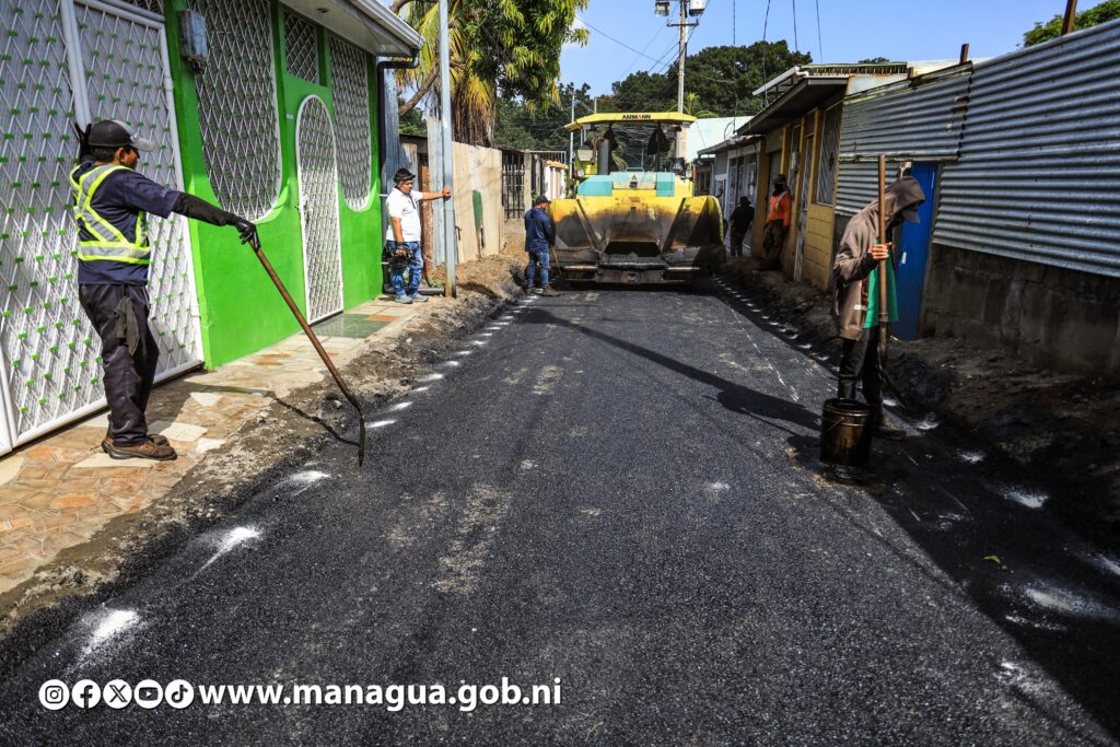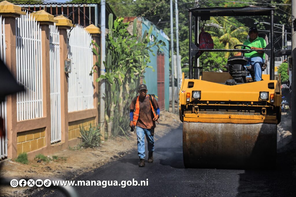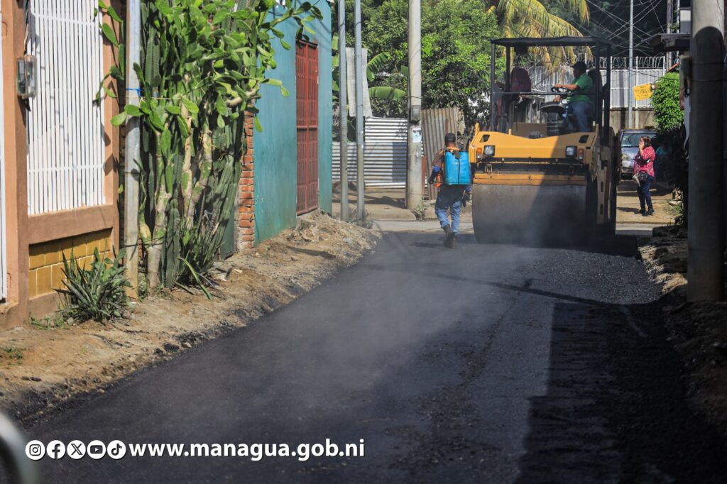 Tres nuevas calles están siendo asfaltadas este lunes, beneficiando directamente a 580 habitantes del barrio Hugo Chávez, ubicado en el Distrito VI de Managua. Dicha obra, que genera más bienestar, mejores vías de acceso, movilidad peatonal y seguridad vial, fue supervisada por la Secretaria del Concejo Municipal, Jennifer Porras.