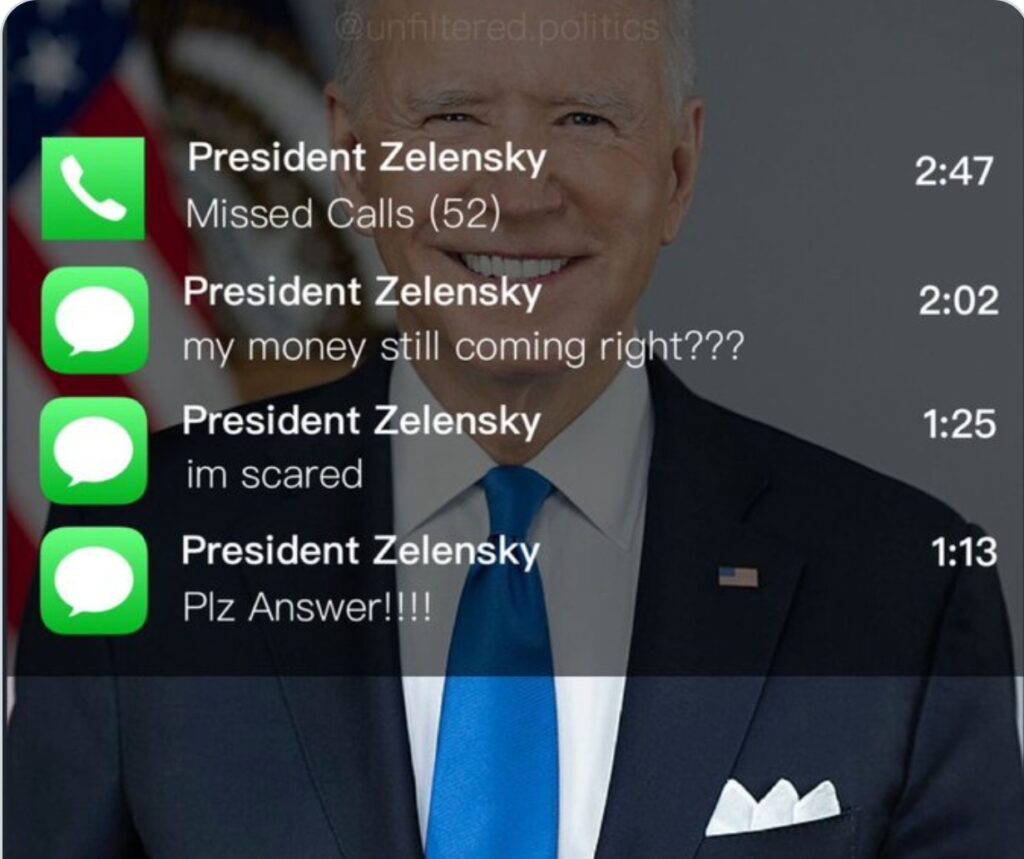 Donald Trump Jr. compartió una captura de pantalla editada que muestra el supuesto teléfono de Biden con numerosas llamadas perdidas y mensajes de Zelenski: “Mi dinero sigue en camino, ¿verdad? Tengo miedo, ¡por favor contesta!“.