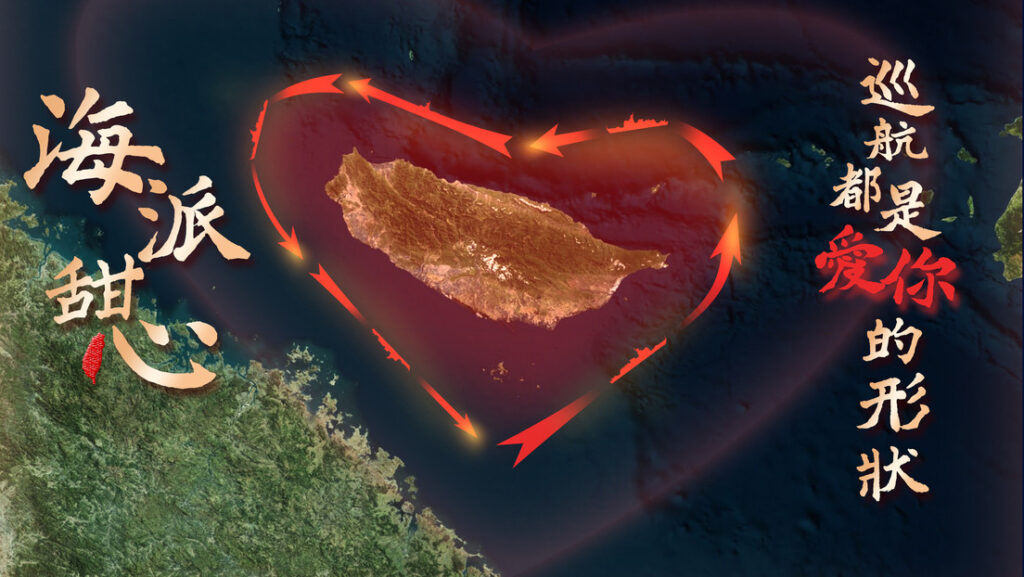 La foto, acompañada con las inscripciones “Hola, mi amor” y “Patrulla en forma de amor para ti“, fue difundida el mismo día en que las Fuerzas Armadas de China realizaron maniobras en el estrecho de Taiwán. Aparentemente, las flechas muestran la ruta de los buques militares chinos.