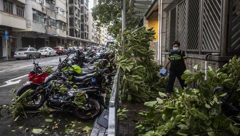 En Heng Fa Chuen, un barrio residencial costero del este Hong Kong, que sufrió la devastación tras el paso del tifón Mangkhut en 2018, algunos funcionarios con chalecos naranjas instaron a curiosos que querían ver la tormenta a que retornaran a sus hogares, en medio del vendaval que sacudía los árboles.